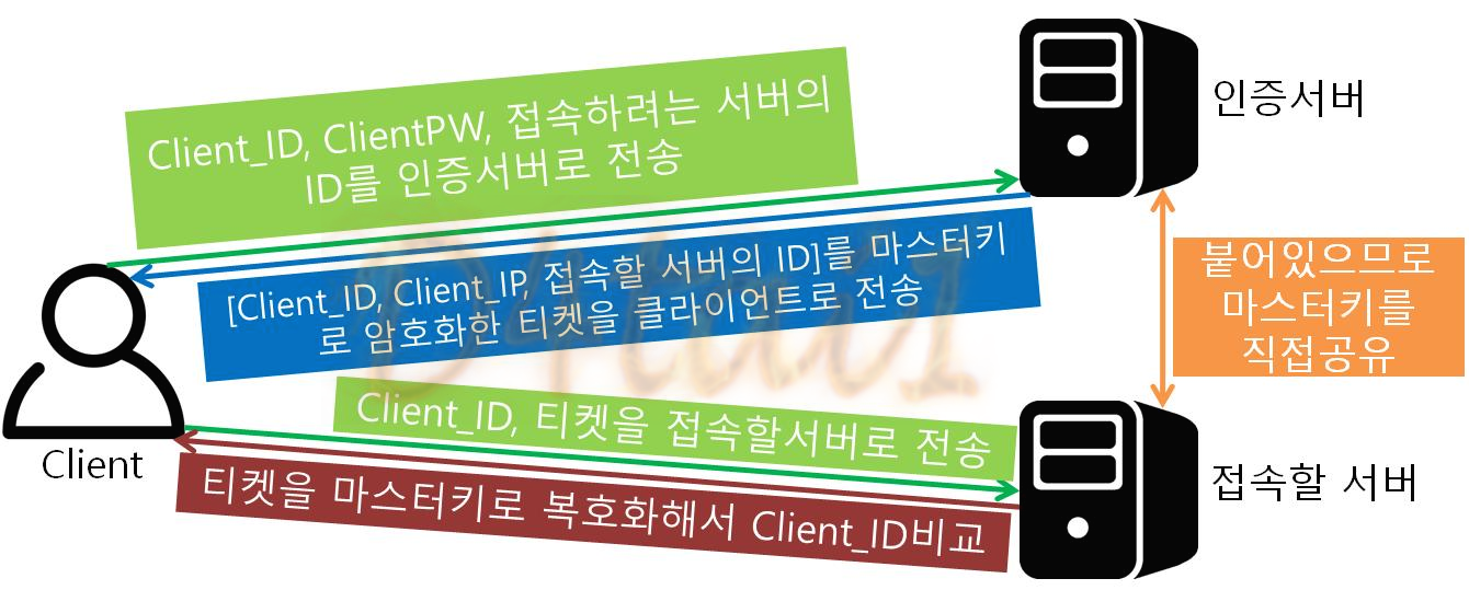 ▶ 인증서버 => master_key로 Encryption[클라이언트의 ID, 클라이언트의 IP, 접속하려는 서버의 ID] = 티켓