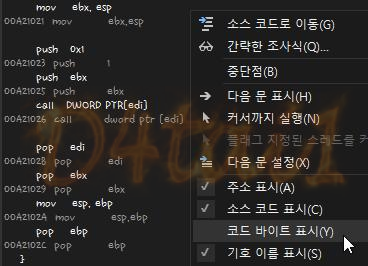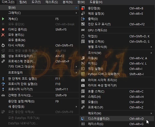 [디버그] - [창] - [디스어셈블리]를 누르면