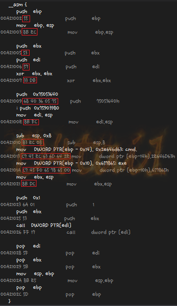 mov DWORD PTR[ebp - 0x14], 0x2e646d63; cmd.