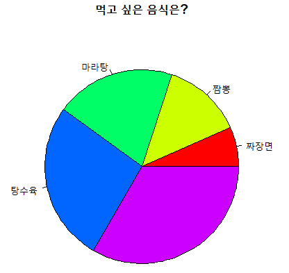pie(ans, labels=names(ans), col=rainbow(5), main="먹고 싶은 음식은?")