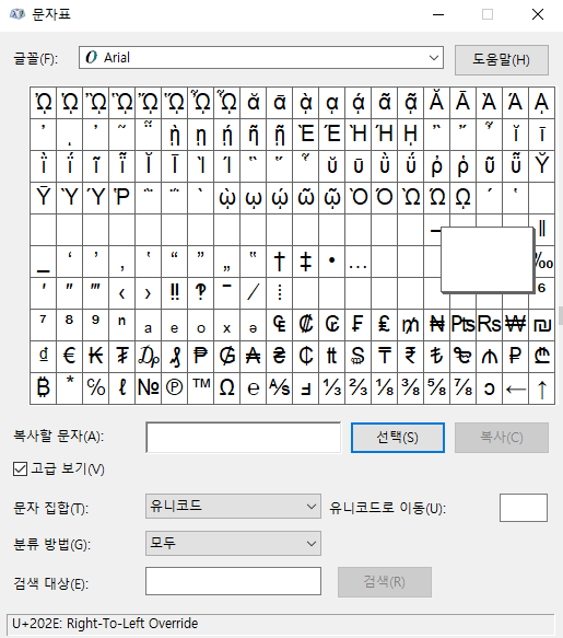 이 문자표를 키고 U+202E를 선택한 후