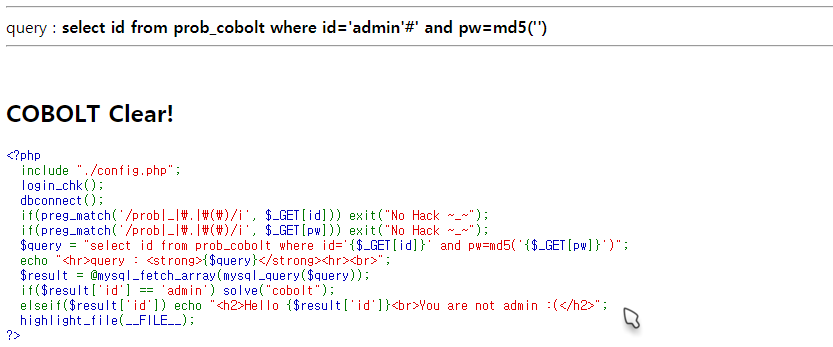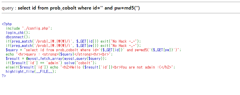 $query = "select id from prob_cobolt where id='{$_GET[id]}' and pw=md5('{$_GET[pw]}')";