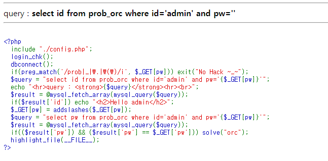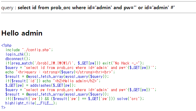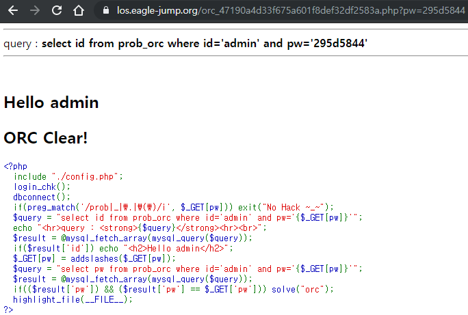 if(($result['pw']) && ($result['pw'] == $_GET['pw'])) solve("orc");