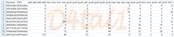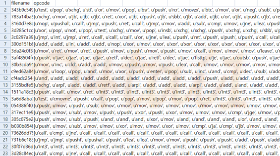▶ opcode n-gram : 바이너리를 입력 받아서 opcode 4-gram을 추출 후 csv로 출력한다.