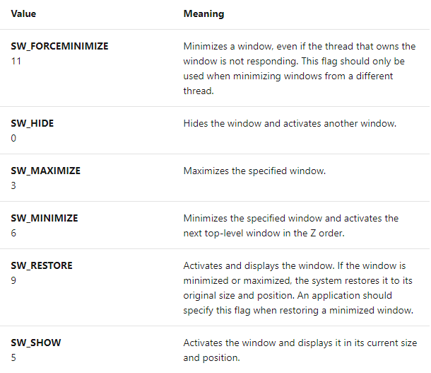 저는 눈으로 확인을 해보기 위해 창을 띄우고 디스플레이하는 SW_SHOW(5)를 넣어 보겠습니다.