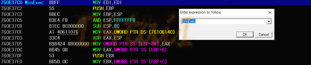다음엔 WinExec의 주소를 얻어와서 악성행위를 하는