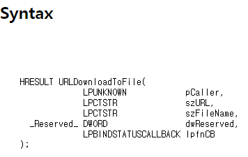 URLDownloadToFile는 특정 URL에 접속해서 파일을 다운로드 받는 함수입니다.
