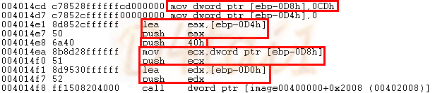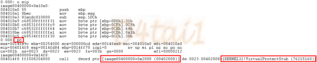 VirtualProtect(0x14fea0, 0xcd, 0x40, 0x14fe9c);