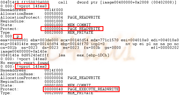 [!vprot 14fea0] : VirtualProtect()의 첫 번째 인자인 변경할 영역주소를 넣고 확인했습니다.