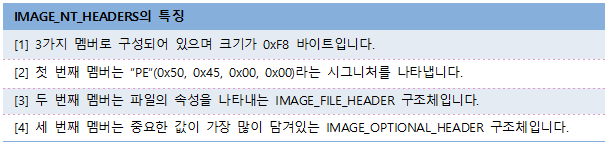 IMAGE_NT_HEADERS는 3가지 멤버로 구성되어 있습니다.