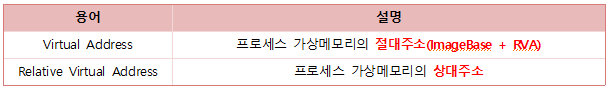 VirtualAddress : 메모리에 내 섹션의 상대주소(섹션 헤더 내 필드/실제로는 RVA)